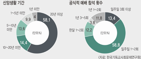 Çѱ¹±³È¸ ¼ºµµµéÀÇ ½Å¾Ó»ýȰ °æ·ÂÀº ±æ¾îÁ³Áö¸¸ °ø½Ä ¿¹¹è Âü¼® Ƚ¼ö´Â ÁÙ¾îµé°í ÀÖ´Ù. ½Å¾Ó½ÉÀÌ ¾ó¸¶³ª ±íÀº°¡¸¦ ¹¯´Â Áú¹®¿¡´Â Àý¹Ý °¡±îÀÌ ¡®º¸Å롯À̶ó°í ´äÇß´Ù.